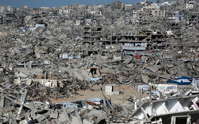 Gazans watch as Hamas gunmen flank Israeli hostages (L-R) Ohad Ben Ami, Eli Sharabi and Or Levy on a stage before handing them over to a Red Cross team in Deir el-Balah, central Gaza, on February 8, 2025 (Bashar Taleb / AFP)The Gaza terror state built by Hamas in its ongoing declared goal of destroying Israel is largely in ruins, largely uninhabitable, and the Gazans that Hamas most deliberately placed in harm’s way are indeed suffering terrible harm — but with Israel, not Hamas, now having chosen to make itself responsible. Israel is rapidly alienating most of its closest allies while, internally fragmented, the vast majorityof the public is desperate to end the war in exchange for the release of all the hostages.