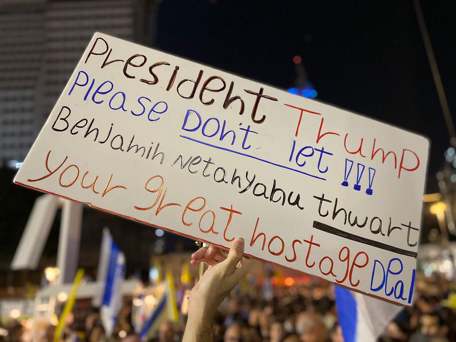 “We can’t just rely on Trump. I call on the country’s citizens — everyone who supports the return of hostages, everyone who supports an end to the war and the return of the soldiers, take to the streets with us,” she says.