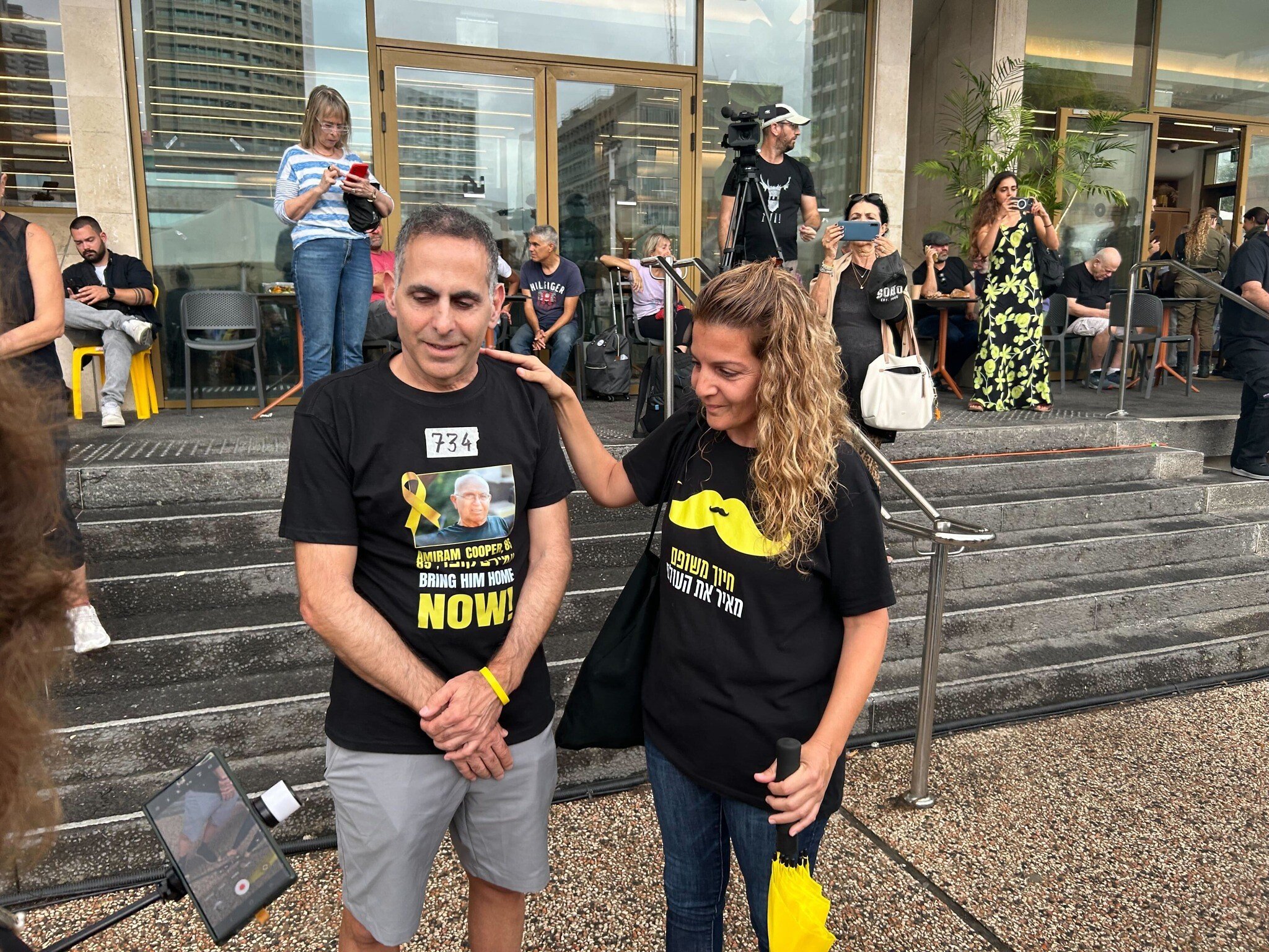 “You don’t make any preparations, you take it one day at a time,” he says at Hostages Square in Tel Aviv. “We want to get some closure. We’re not trying to forget… but we want some small closure and to focus more on building.”