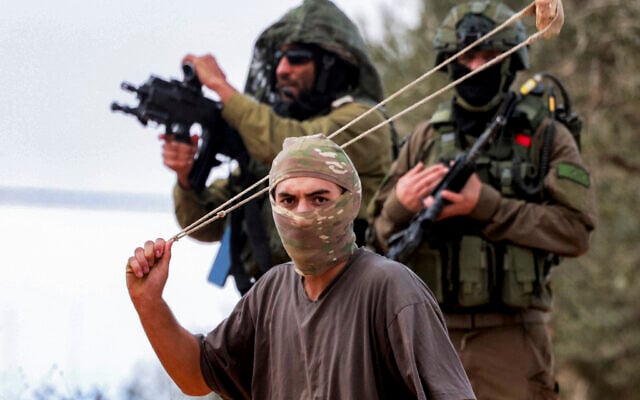 Israeli army soldiers stand behind a masked man swinging a slingshot while hurling stones at Palestinians who had gathered for the annual olive harvest season, during an attack by Israeli settlers on the Palestinian village of Beita, south of Nablus in the West Bank, on October 10, 2025. (ASHTIYEH / AFP)“We strongly condemn this outrageous attack, which is another illustration of the increasingly dangerous working environment for our journalists in the West Bank,” says Mehdi Lebouachera, AFP’s Global Editor-In-Chief.