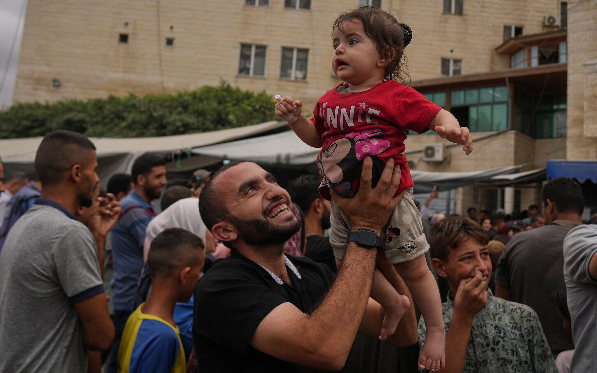 Palestinians celebrate following the announcement that Israel and Hamas have agreed to the first phase of a peace plan to end the war, outside Al-Aqsa Hospital in Deir al-Balah, central Gaza Strip, October 9, 2025. (AP Photo/Abdel Kareem Hana)“I am happy and unhappy,” said Mohammad Al-Farra. “We have lost a lot of people and lost loved ones, friends,” relatives, and homes that are about a lot more than stones and physical buildings, he said.