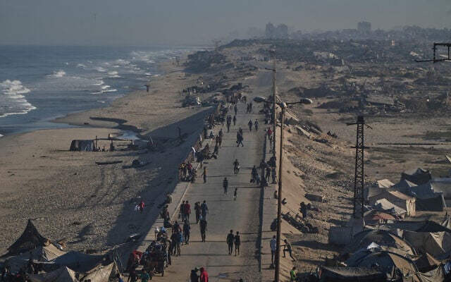 Displaced Palestinians walk along the coastal road near Wadi Gaza in the central Gaza Strip, October 10, 2025. (AP Photo/Abdel Kareem Hana)The war erupted when Hamas-led terrorists rampaged through southern communities on October 7, 2023, murdering some 1,200 people, mostly civilians, and taking 251 hostages.