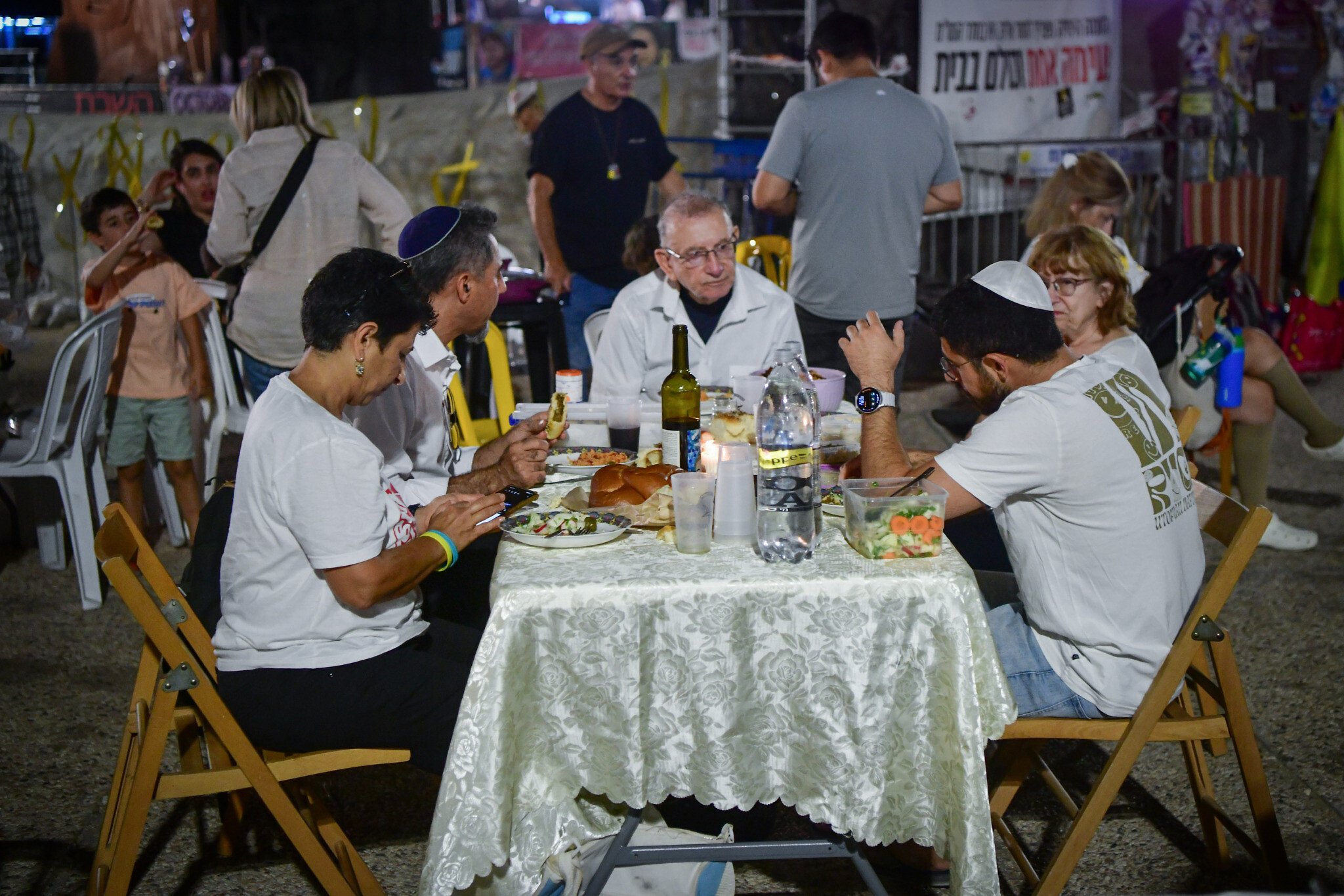 Families of hostages held in Gaza gather in Tel Aviv’s Hostages Square for a Shabbat dinner, which they say they hope will be the last one without their loved ones ahead of their expected release early next week.